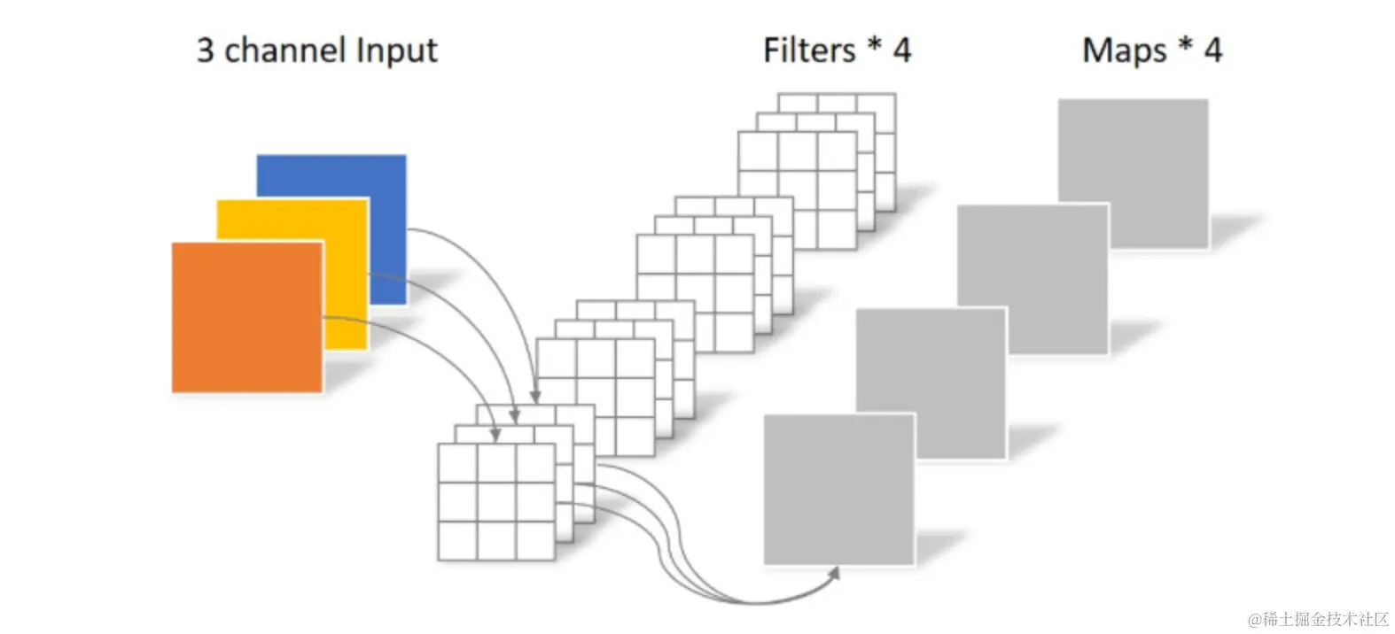 其中一个Filter只包含一个大小为的Kernel,卷积部分的参数个数计算如下: