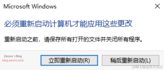 9、此时系统会弹出如下对话框,提醒“必须重新启动计算机才能应用这些更改”,建议您单击【立即重新启动】按钮。如不小心点击了稍后启动按钮,则手动重启Windows系统即可。