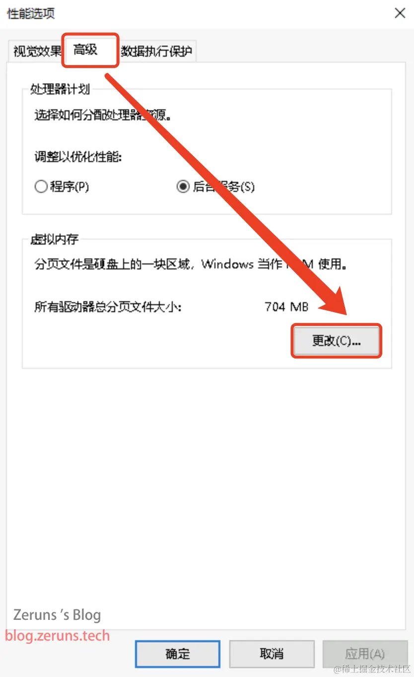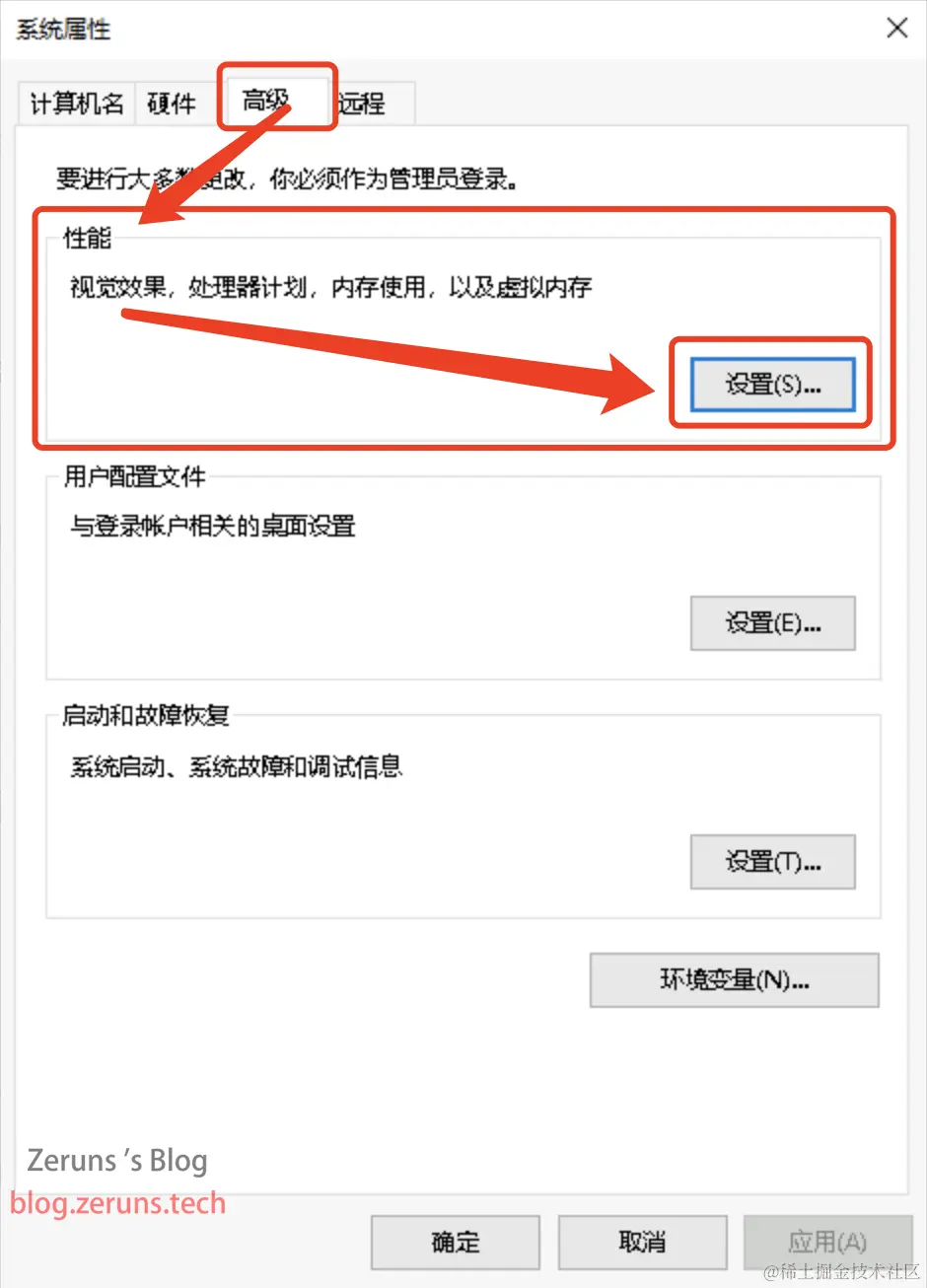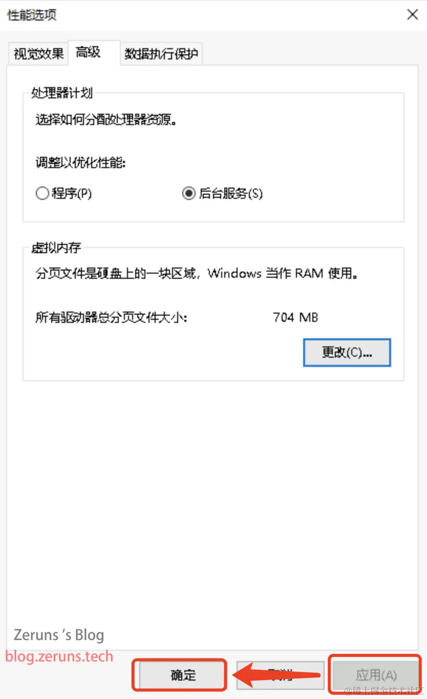 性能选项弹窗:先应用,再确定! 系统属性弹窗:确定。