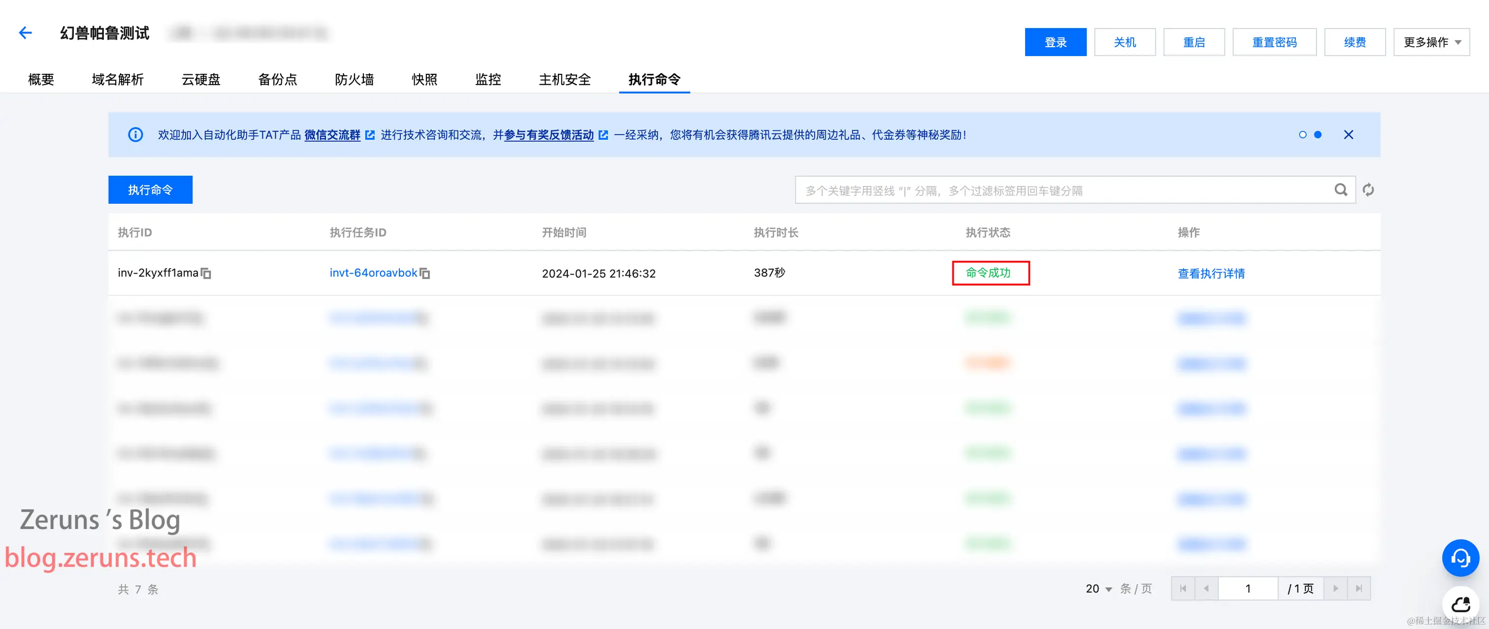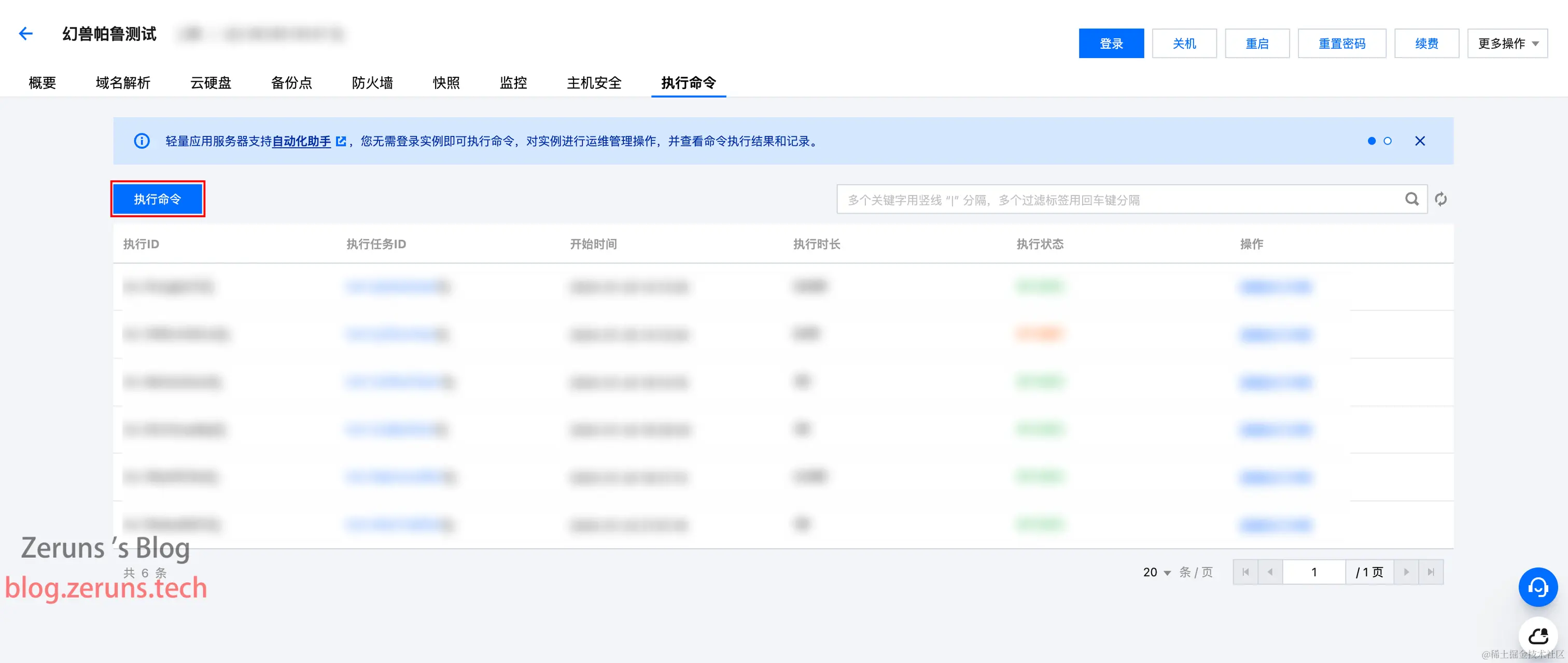 1、在轻量应用服务器控制台,选中对应服务器,单击进入实例详情页,找到【执行命令】页签,即可使用自动化助手的【执行命令】功能。