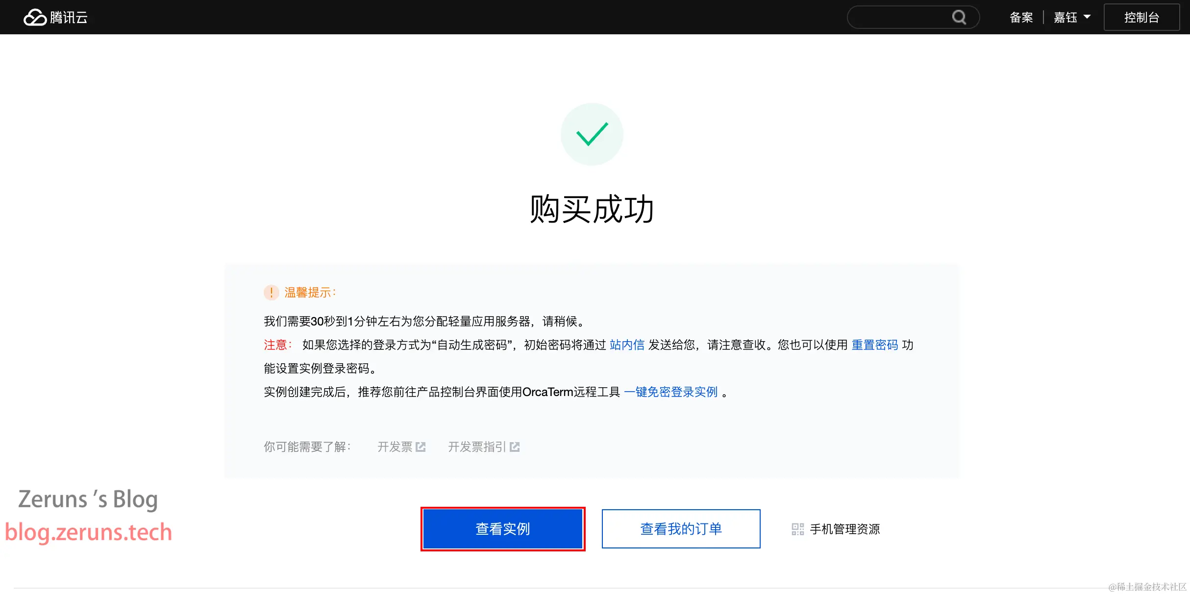 - 支付成功后,您将来到支付成功页,点击“查看实例”,即可前往轻量应用服务器控制台查看刚刚购买的服务器。