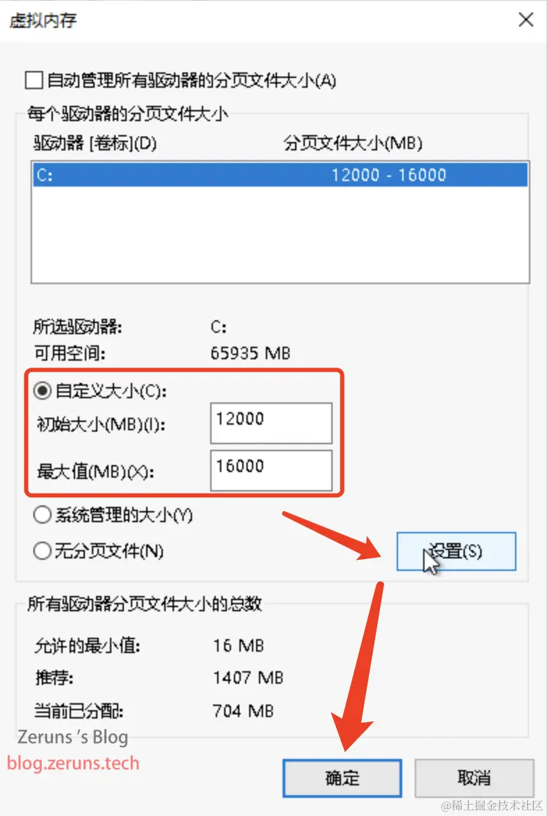 此处以8GB内存的服务器输入初始大小和最大值,再点击【设置】按钮后,单击【确定】。