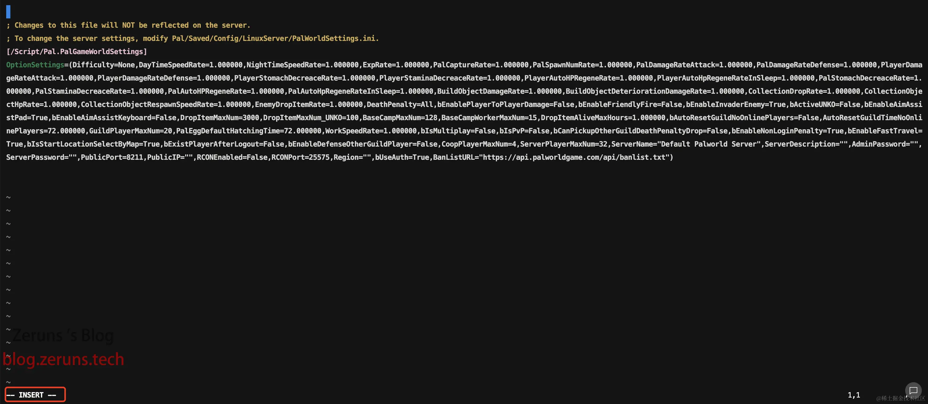 sudo vim /home/steam/Steam/steamapps/common/PalServer/Pal/Saved/Config/LinuxServer/PalWorldSettings.ini