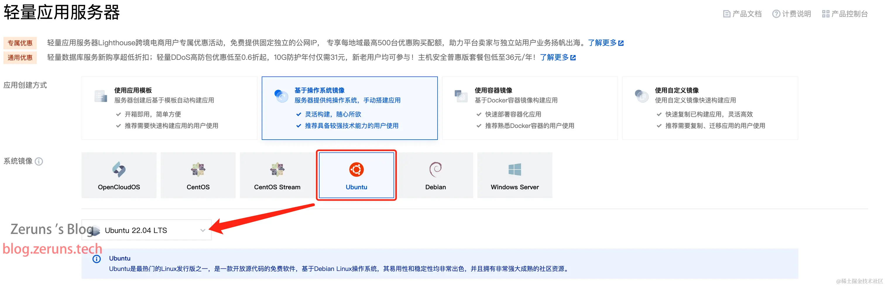 - 选择Ubuntu 22.04 LTS镜像,后续您可以参考后文【方式一:极简一键部署】-【Linux服务器】进行部署。