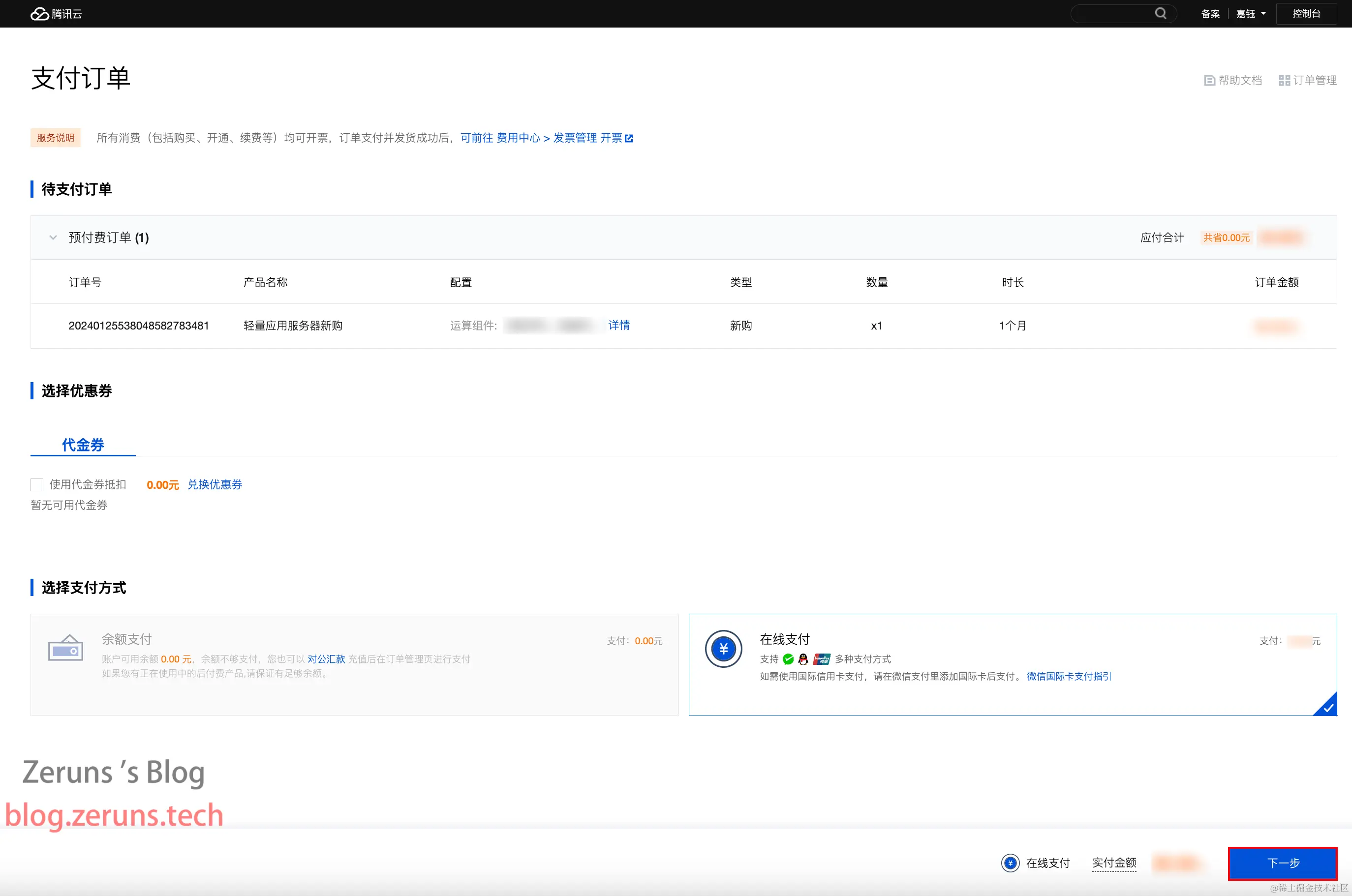 - 您可选择使用余额或在线支付。如您选择在线支付,则需要点击下一步。