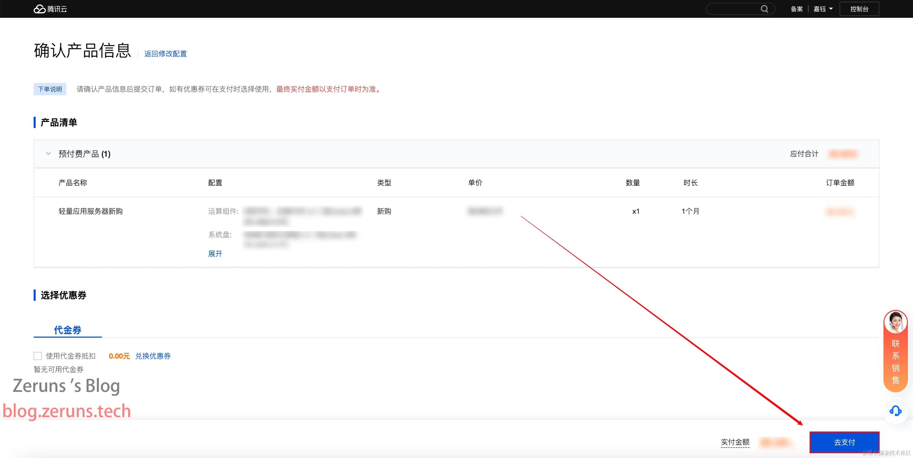 - 确认产品信息,并在页面右下角点击“去支付”。