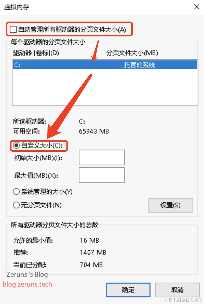 6、在虚拟内存窗口中,首先取消选中"自动管理所有驱动器的分页文件大小"的复选框。然后,选择服务器上的一个驱动器,并选择"自定义大小"选项。