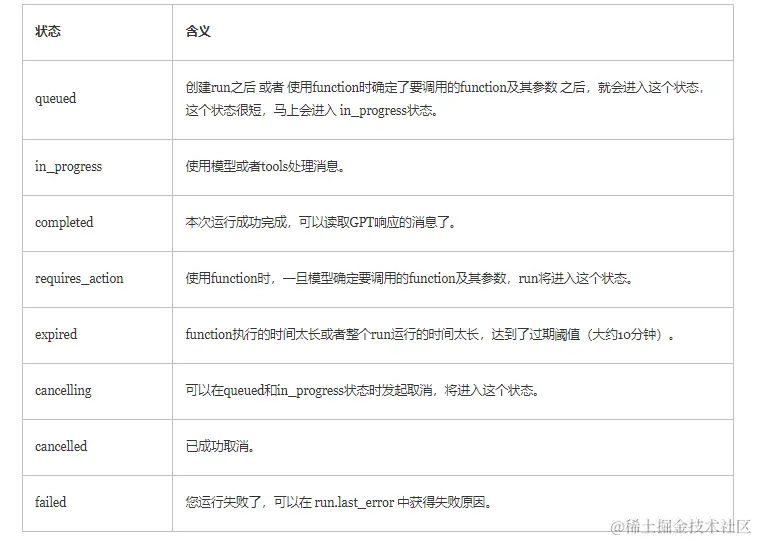 run 有多个状态: queued, in_progress, requires_action, cancelling, cancelled, failed, completed, expired,这个例子中如果不是 queued 或者 in_progress 状态就代表已经有结果了。requires_action 是智能助手使用 function 工具时才会存在的状态,这个例子不涉及。