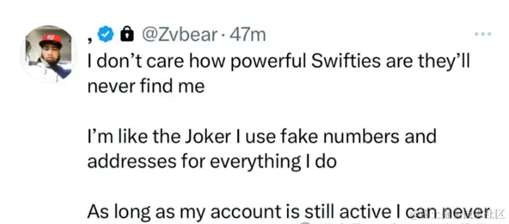 这位始作俑者可以说是十分嚣张了。直接了当的表示并不在乎霉霉怎么样,还挑衅说:“你们永远都找不到我!”不过事情并不会如这位恶人所愿。霉霉粉丝们似乎很熟悉社会工程学,此人目前已经怂了。不但如此,社交账号已经屏蔽!