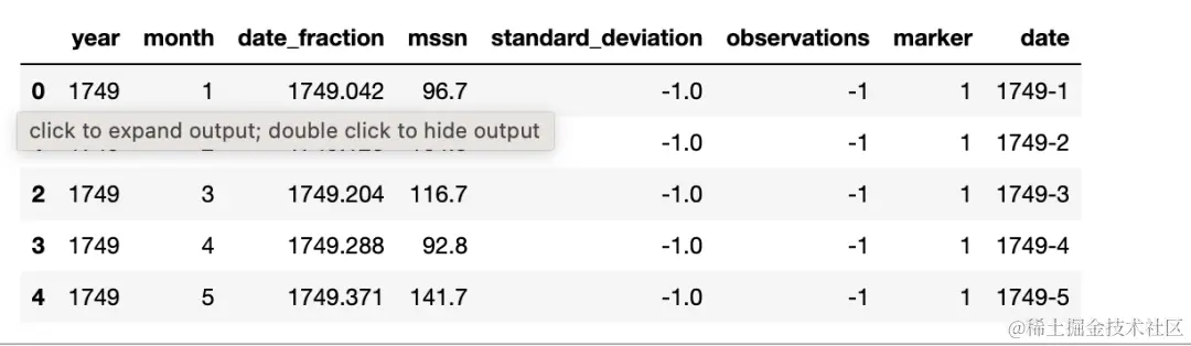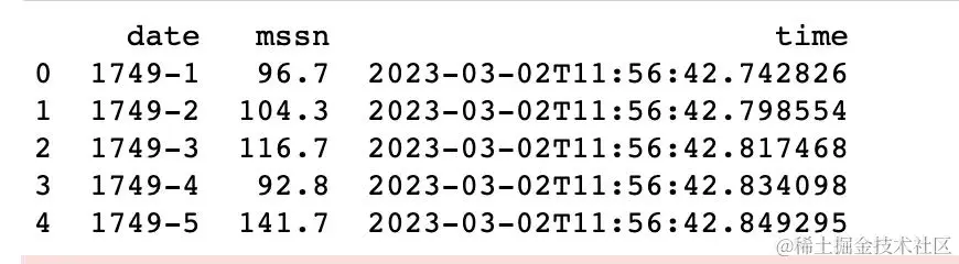 为了简化分析,我们只需存储数据集中观测时间和太阳黑子数。因此,我们将年(Col 0)和月(Col 1)拼接作为观测时间(date, 字符串类型),月均太阳黑子数(Col 3)可以不作处理直接存储。