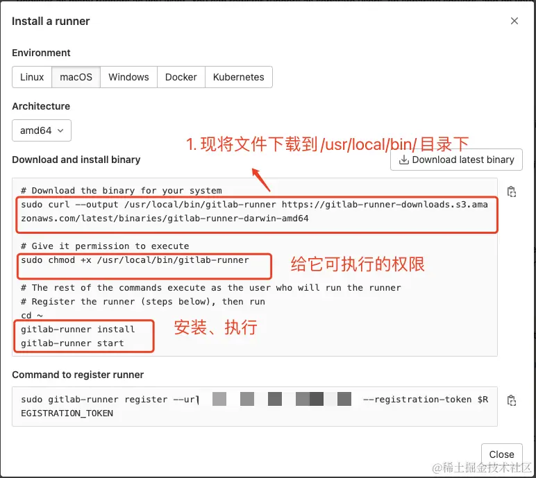 打开之后,提供了适配各种系统的runner,选一个适配你系统的进行下载运行,例如我用macos举例,直接在命令行里进行操作即可: