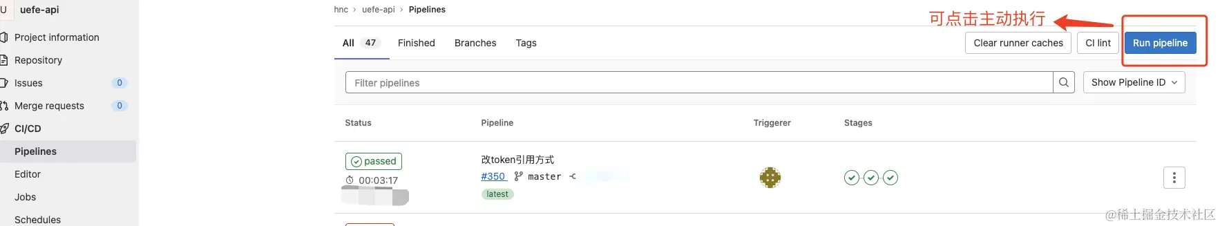 这时候我们再去看一下CI/CD执行的情况,如果未执行,可点击主动执行: