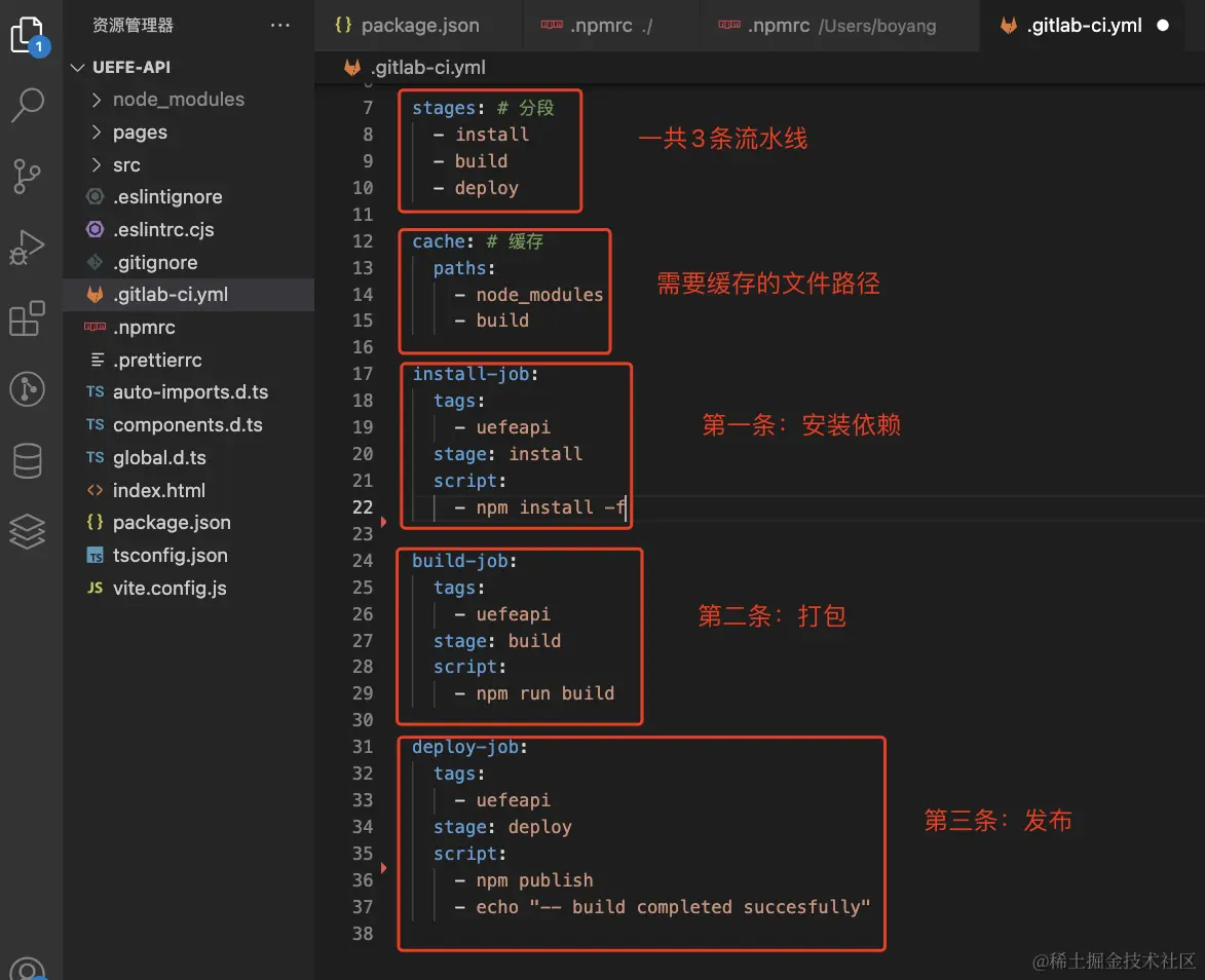 注意:这个.npmrc一定要配置正确,特别是这个token,它是跟CI脚本配合执行的,不然在publish阶段会一直提示身份验证不通过等字眼。