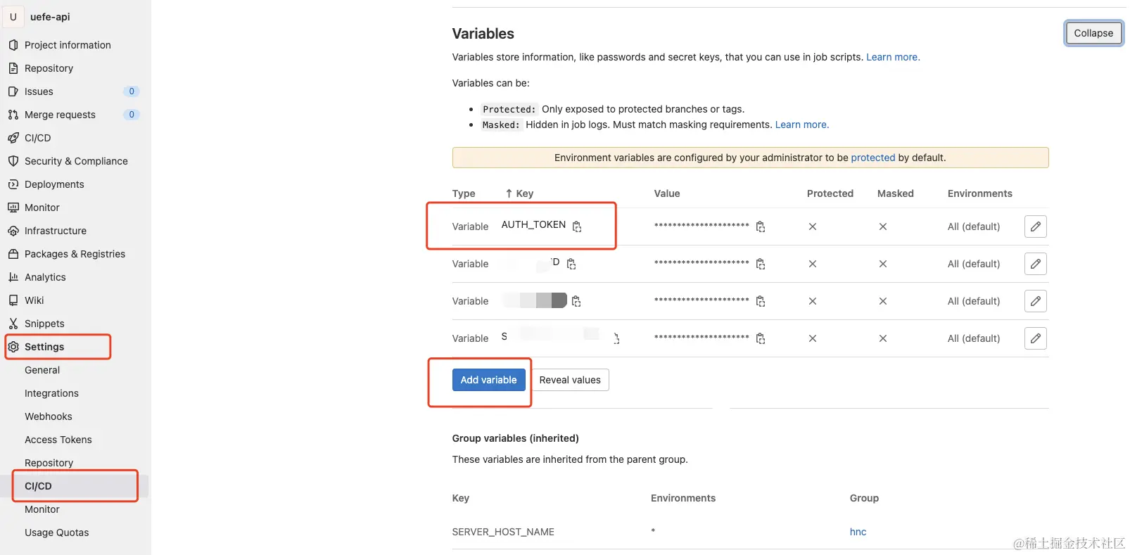 这里gitlab支持添加一些私密性的变量,当你添加了之后,执行gitlab-ci.yml脚本的时候会自动读取到这个变量!