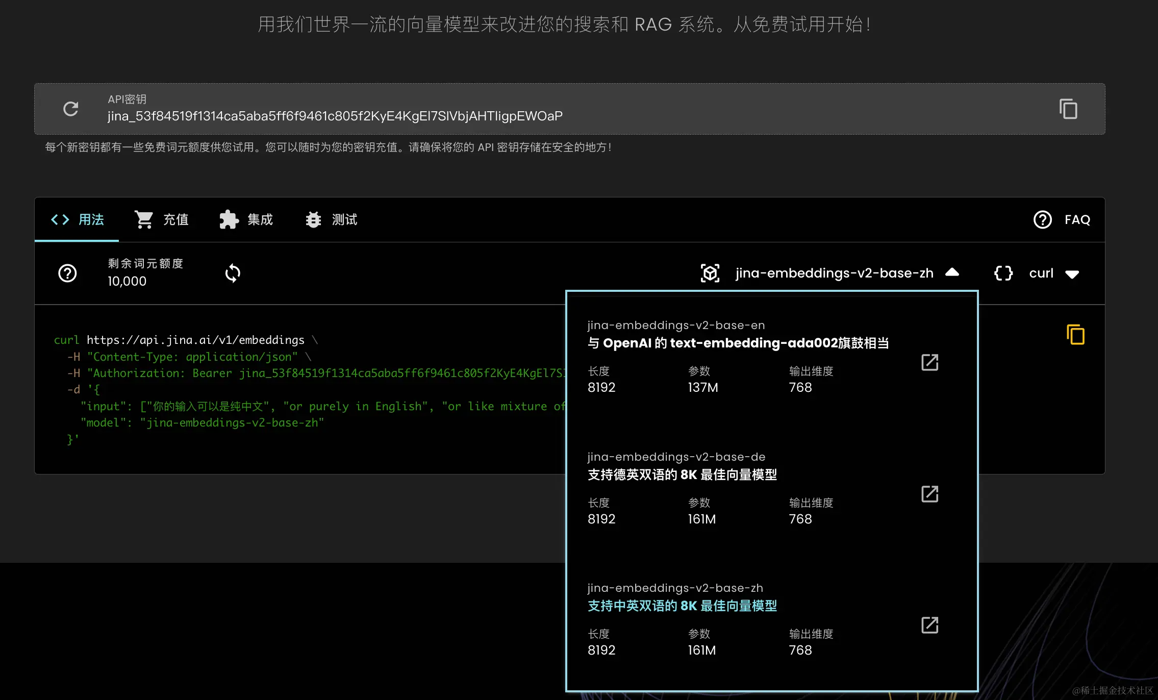 使用 Jina Embeddings 的最简单方法是使用 Jina AI 的 Embedding API。