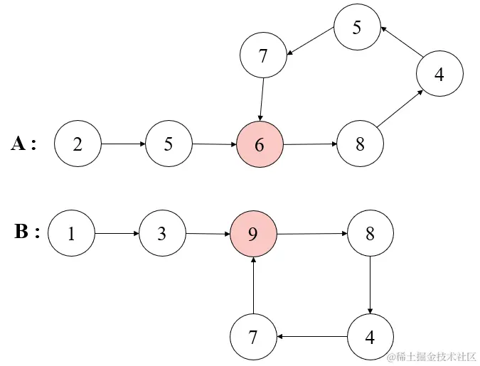 A B 均无环。如果 A B两链表相交,则转化为了 无环链表找相交点 的问题。