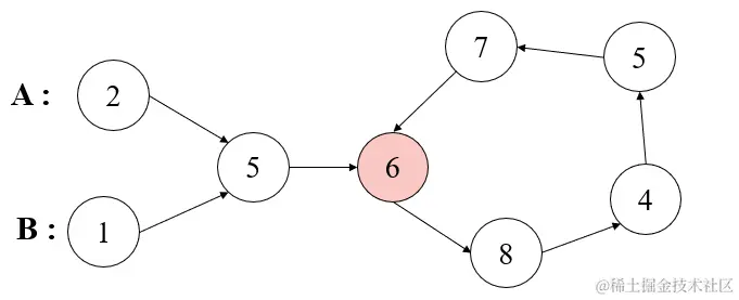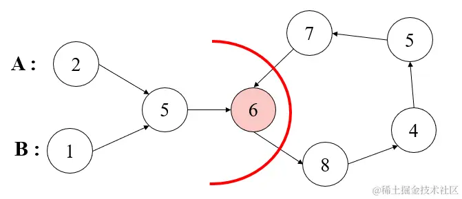 if 条件进行的是 2)A 环 B 环相交,有同一个入口点 情况的判断。