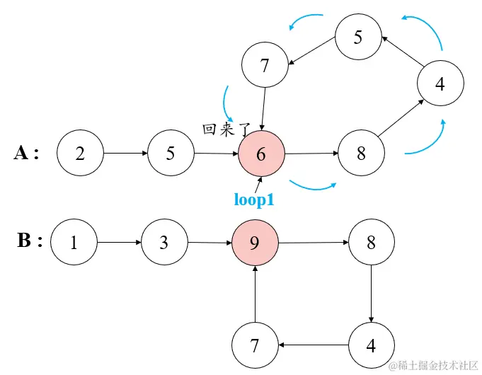 1)如果两个环相交,那么 loop1 一定会在 一圈未走完 的情况下与 loop2 相遇。