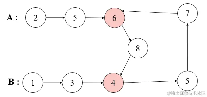以 入口点 作为两个链表的结束,红色范围 左侧 就转化为了 两个单链表找交点 的题目。