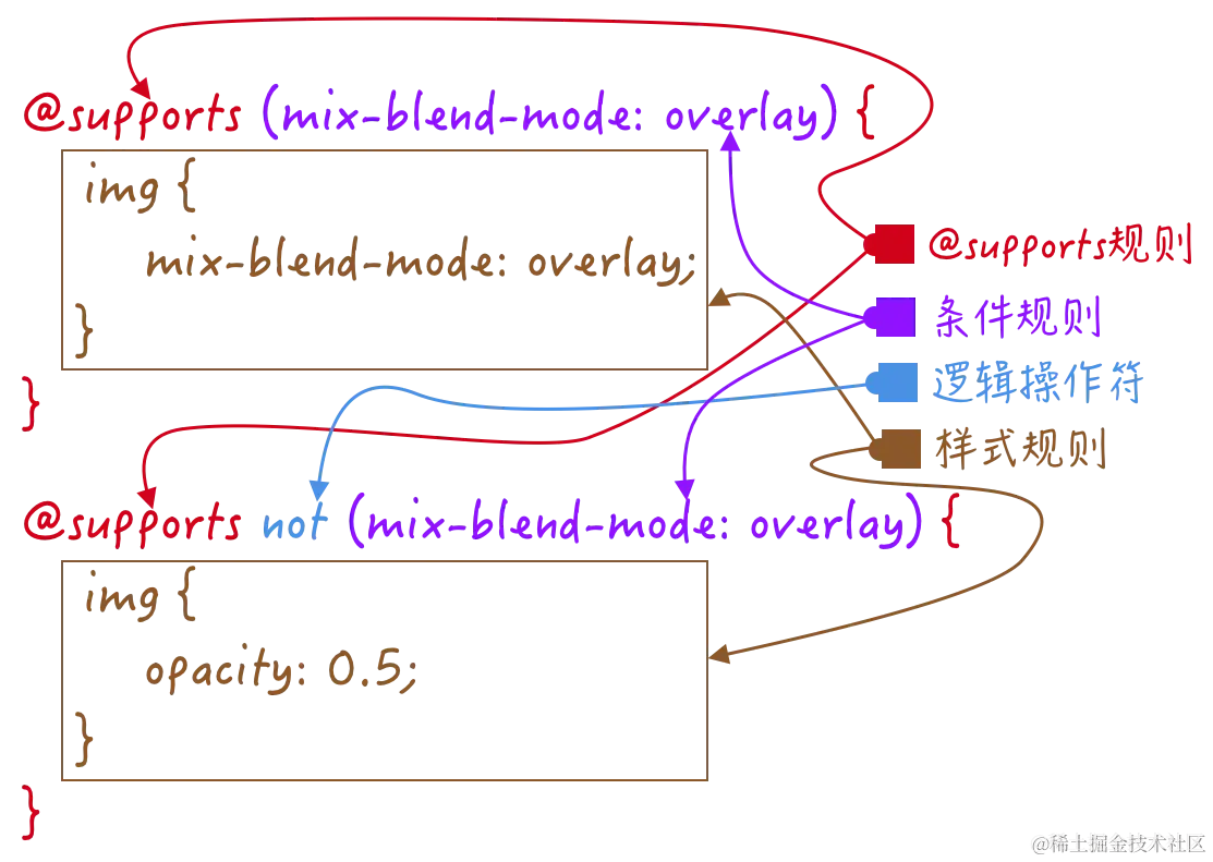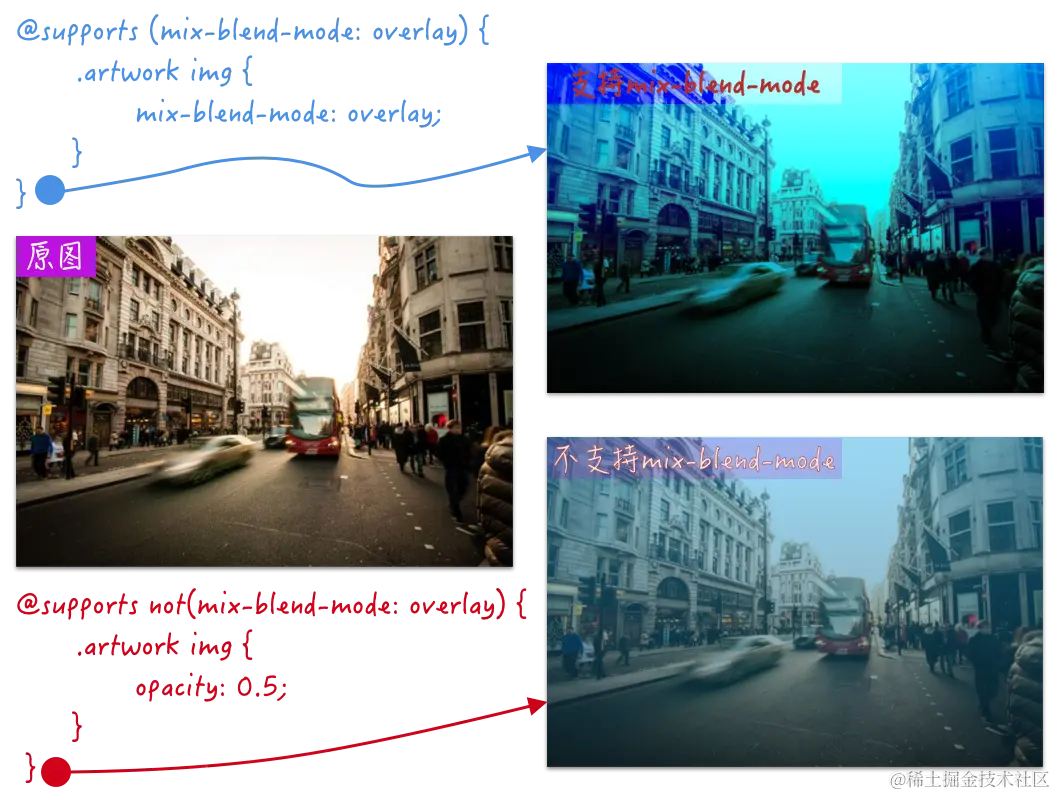 上面的示例代码将会告诉浏览器,如果支持mix-blend-mode:overlay样式规则,将会执行@supports (...) {...}中的CSS:
