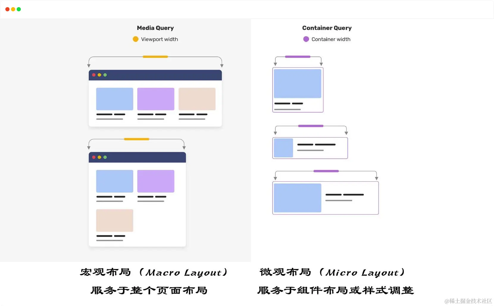 需要知道的是,容器查询的出现并不是用来替代媒体查询的,它们两者应该是共存的关系。容器查询特性的出现,我们可以不再局限于视窗断点来调整布局或 UI 样式,还可以基于容器断点来调整布局或 UI 。换句话说,媒体查询是一种宏观的布局(Macro Layout),可以用于整体页面布局;而容器查询可以调整组件的每个元素,创建了一种微观的布局(Micro Layout) 。