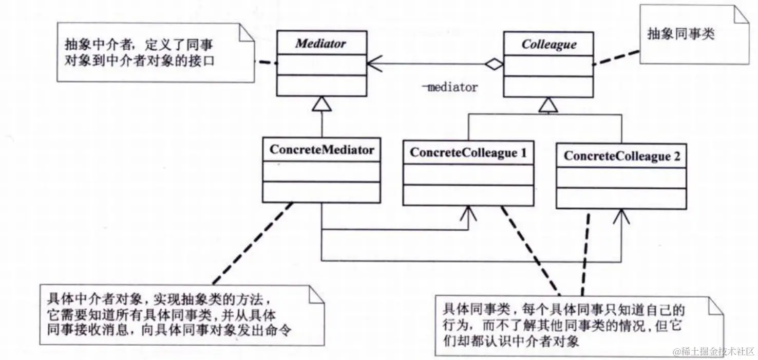 - 提高重用性:在中介者模式中,同事类主要用来实现一些业务功能,由于它与其他同事类的交互都委托给了中介者,因此各个同事类是松散的、可复用的技术构件,它们和其他同事类或中介者之间不存在直接的依赖关系,是满足“开闭原则”的典型模式。