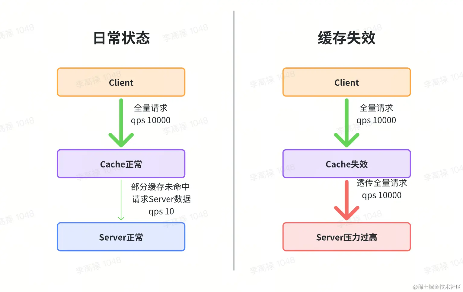 在高并发系统中,缓存为服务器/数据库承担了大部分外部压力。一旦缓存失效就会导致服务器/数据库无力响应请求,系统崩溃。常见的缓存失效原因如下