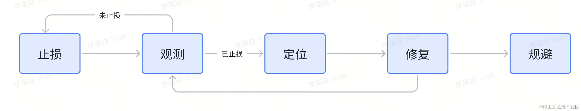 上述的规避方式主要是在设计初期考虑业务场景进行规避,一旦未提前考虑到相关问题,依然会导致线上事故。这时候就要按照通用的事故处理流程执行了,即: