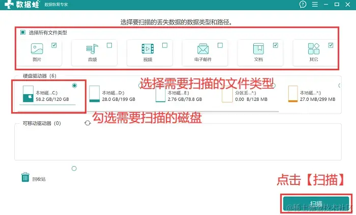 步骤1:安装完软件后,先使用【免费试用】模式,对需要扫描的文件类型和需要扫描的磁盘进行勾选,并点击 【扫描】 ;