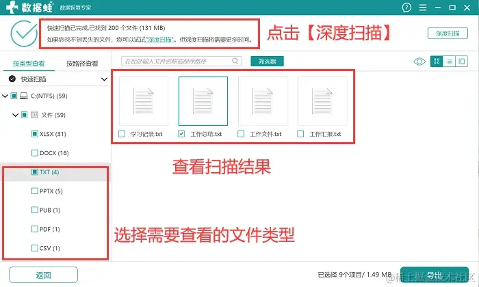 步骤2:在初次扫描完成后,点击想要查看的文件类型,并在右侧查看是否有需要恢复的文件,如果扫描结果中没有呈现,点击【深度扫描】;