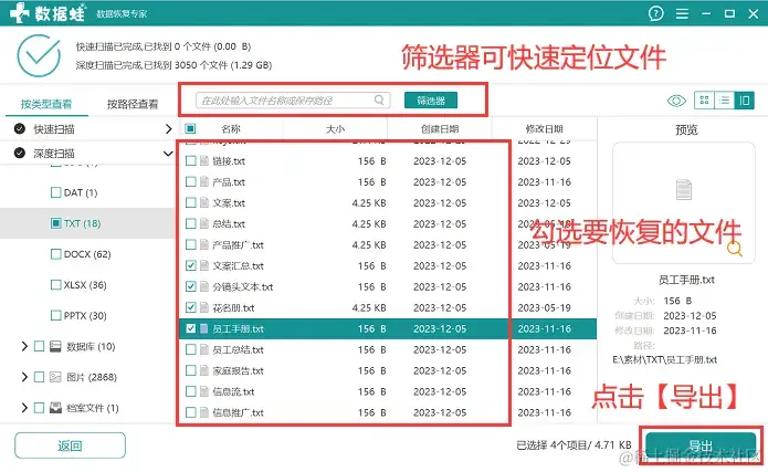 步骤3:深度扫描完成后,用户可以尝试【筛选器】对扫描到的结果进行条件筛选,快速定位到需要恢复的文件后,将文件勾选上,并点击【导出】。