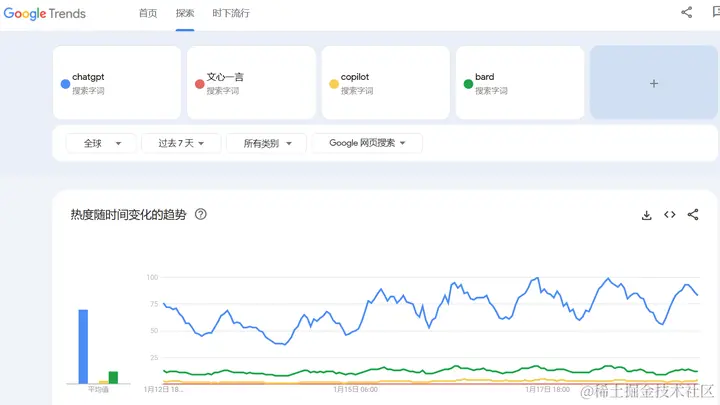 以下是全球对ChatGTP、Google Bard、文心一言、New Bing(Copilot)的关注情况,ChatGTP是遥遥领先的。