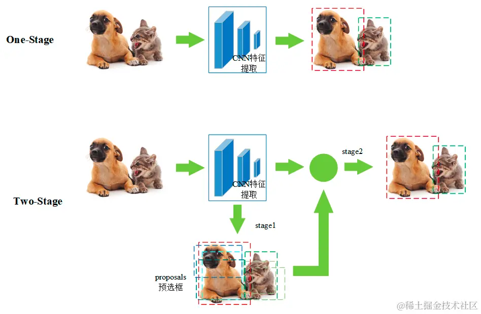 Two-Stage 主要思路:先进行区域生成,即生成候选区域(Region Proposal),在通过卷积神经网络预测目标的分类与定位;