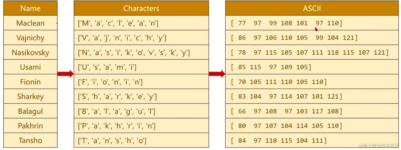 如,第一个名字中的‘M’字符,所对应的为77,意思是指M所对应的为一个独热向量,第77位为1,其他位置全部为0。