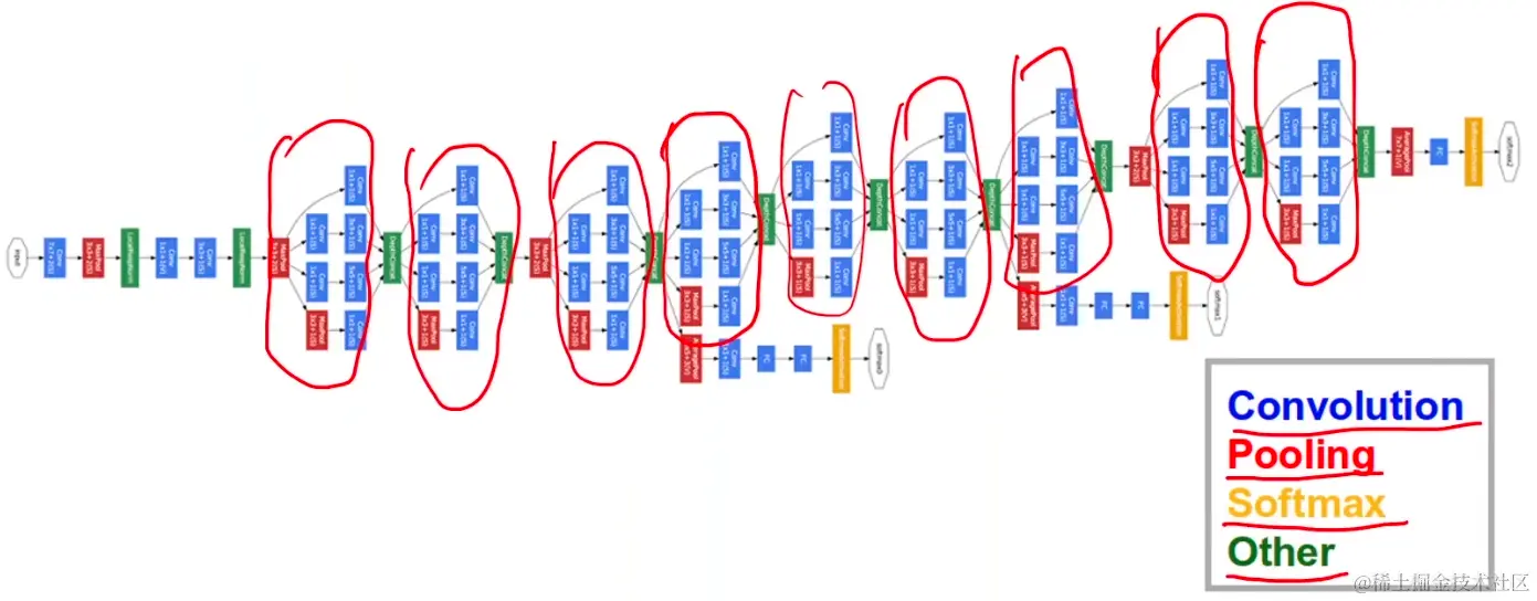 如GoogLeNet,我们将如图中红圈画出来的框,称为Inception。