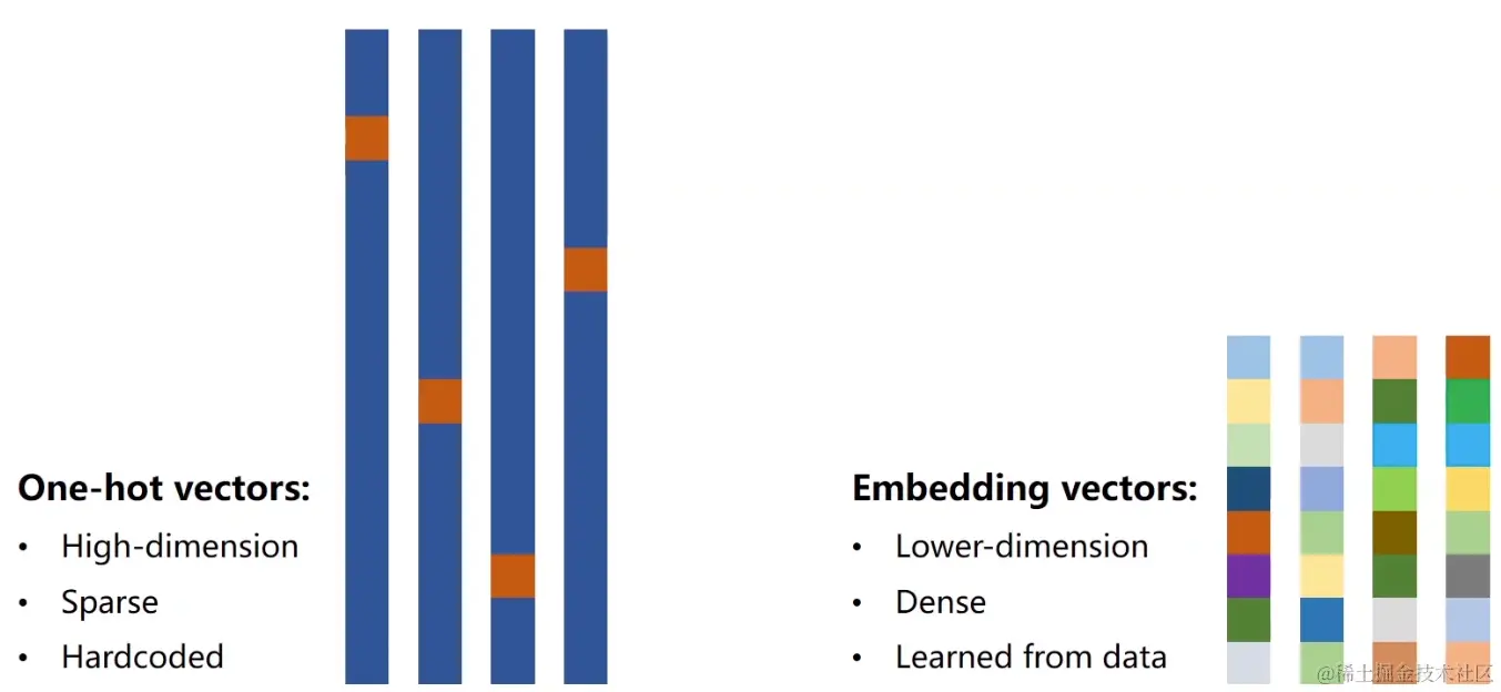 所以,我们想找到一种低维、稠密、通过学习得到的方法,来建立词和向量之间的关系:一种流行的方法为:Embedding(嵌入层)。