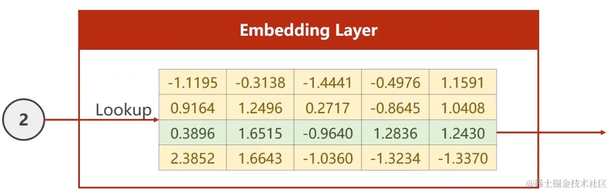 假设嵌入层是5的,从4维转换为5维,就构建上图这种的矩阵。可以在里面进行查询。比如输入的是2,就是指第2个字符,在表里面找到第二行(索引:2),把向量输出。
