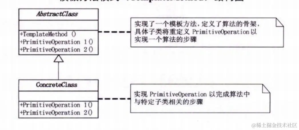 - 各子类中公共的行为应被提取出来并集中到一个公共父类中以避免代码重复:首先识别现有代码中的不同之处,并且将不同之处分离为新的操作。最后,用一个"模板方法"来调用这些新的操作。