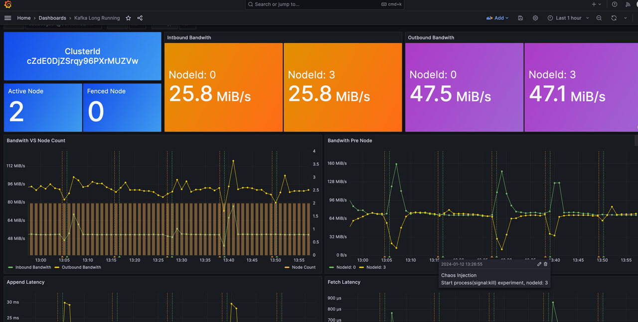 AutoMQ Kafka 新增 7 * 24h Chaos 质量验证框架。Kafka 集群 7 * 24h 全天候运行,框架定期注入网络 10s 延迟、进程 kill -9、进程 pause 等故障,并且校验注入故障后的数据完整性、发送 & 消费 SLA 和故障自愈时间。