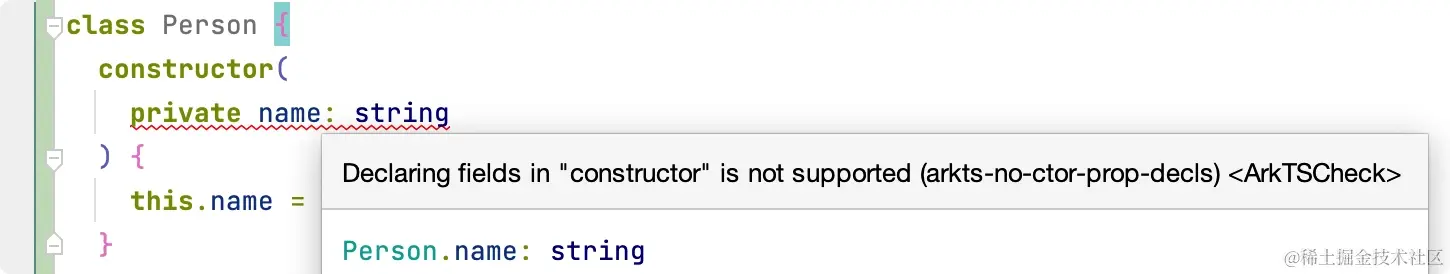 正如你所见,在 constructor 中声明字段 name,然后在 getFullName() 方法中可以使用 name,但是在 ArkTS 中不支持在 constructor 中声明类字段,编译器直接会报错。