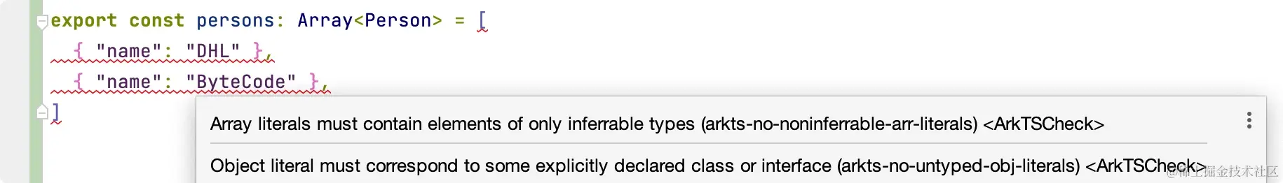 上面的代码在 TypeScript 中可以正常运行,当看到这段代码有没有觉得很奇怪,创建一个对象,这个对象的元素和类 Person 成员变量一致,就可以往数组中添加,我还是第一次见到代码可以这样写。切换到 ArkTS 会报错,禁止这样写。
