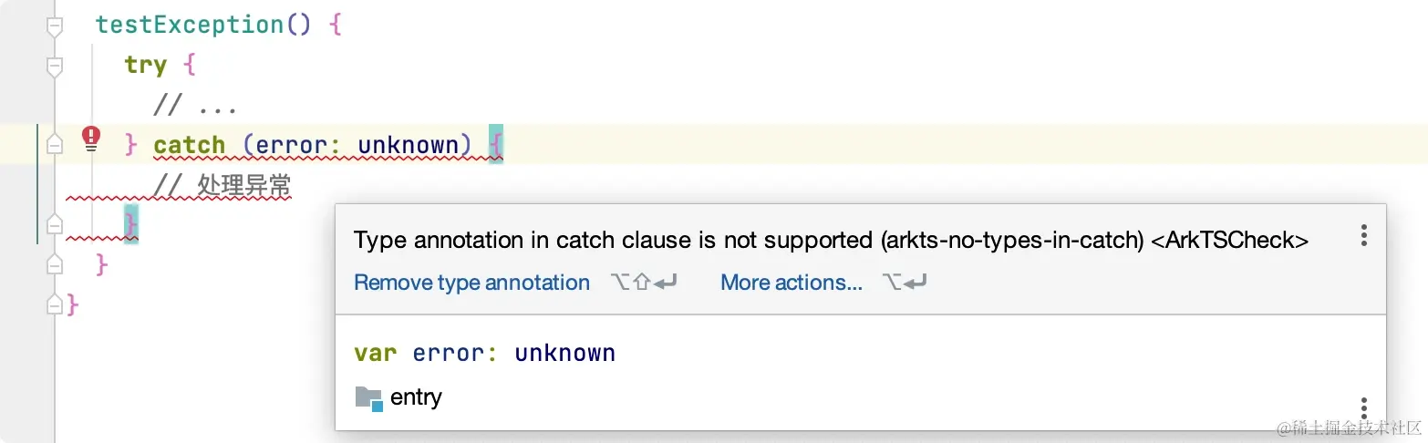 在 ArkTS 中要求强制使用静态类型,如果能够推断出具体的类型,ArkTS 允许省略具体类型,否则需要指定具体类型。但是 catch 语句中有点不一样,先看示例代码。