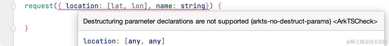 参数的解构虽然方便,但是导致的结果代码变得难以理解,因此在 ArkTS 禁止这样写,上面示例在 ArkTS 中会报错。