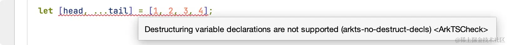 因此,经过这行代码后,head 的值将是 1,而 tail 的值将是数组 [2, 3, 4]。解构赋值很方便,越方便越容易被开发者滥用,解构赋值可能会导致代码变得难以理解,尤其是复杂的嵌套结构,降低了代码的可读性和可维护性,因此在 ArkTS 禁止这样写,上面示例在 ArkTS 中会报错。