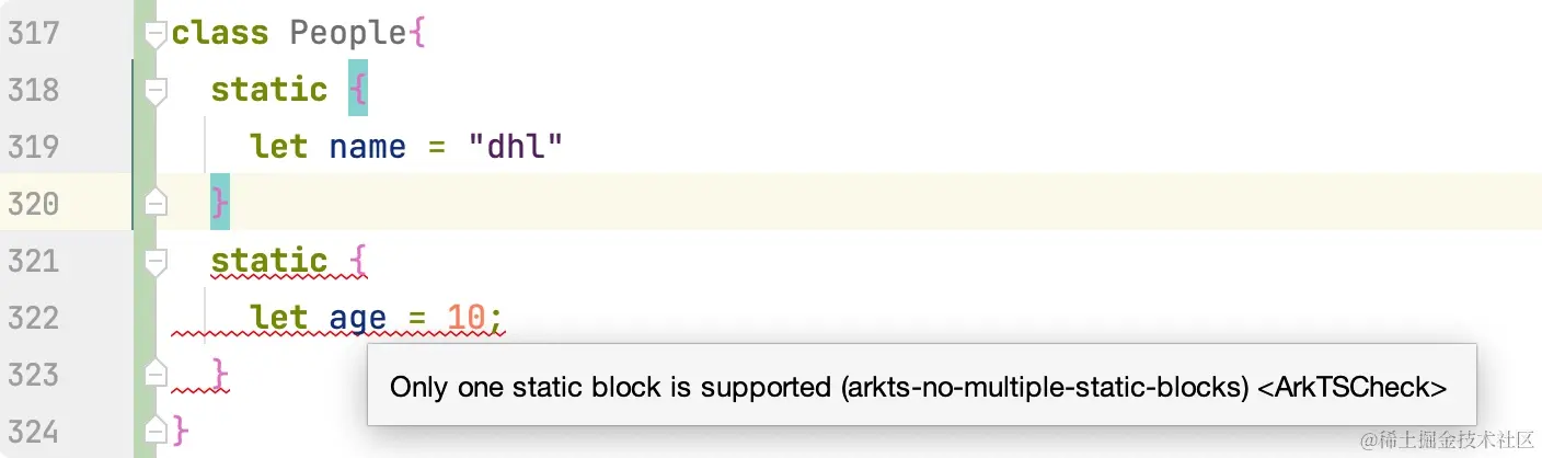 虽然 TypeScript 支持,但是我还没见过有人会在类中定义多个静态代码块。在 ArkTS 中不允许类中有多个静态块,和 Kotlin 或者 Java 语言对齐的,如果使用多个,编译器会给出错误提示,因此我们需要将多个合并为 1 个。