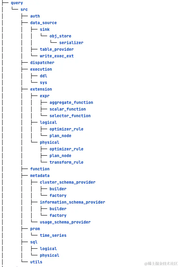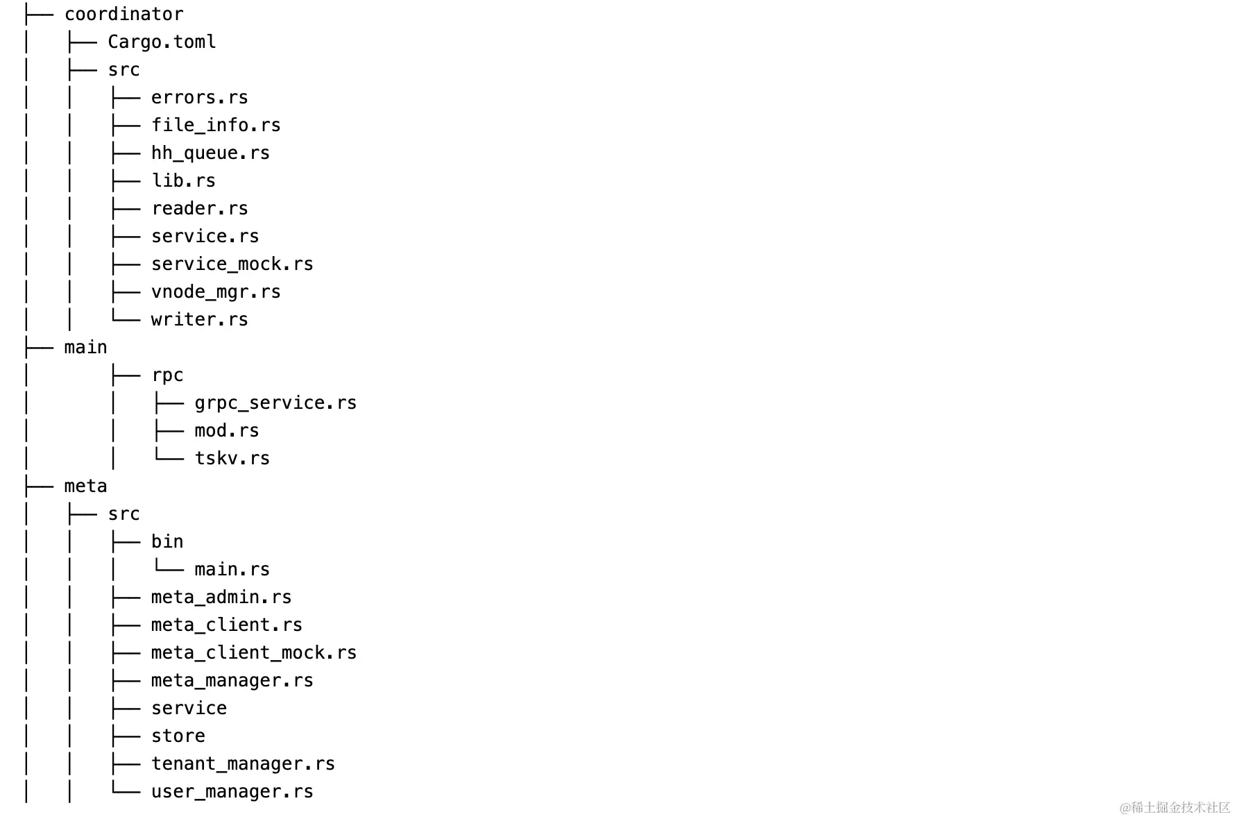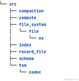 CnosDB的源代码主要分为Query Engine和Storage Engine。Query Engine在query_sever下,里面是query相关的代码。Storage Engine在tskv目录下,主要是时序存储相关的代码。
