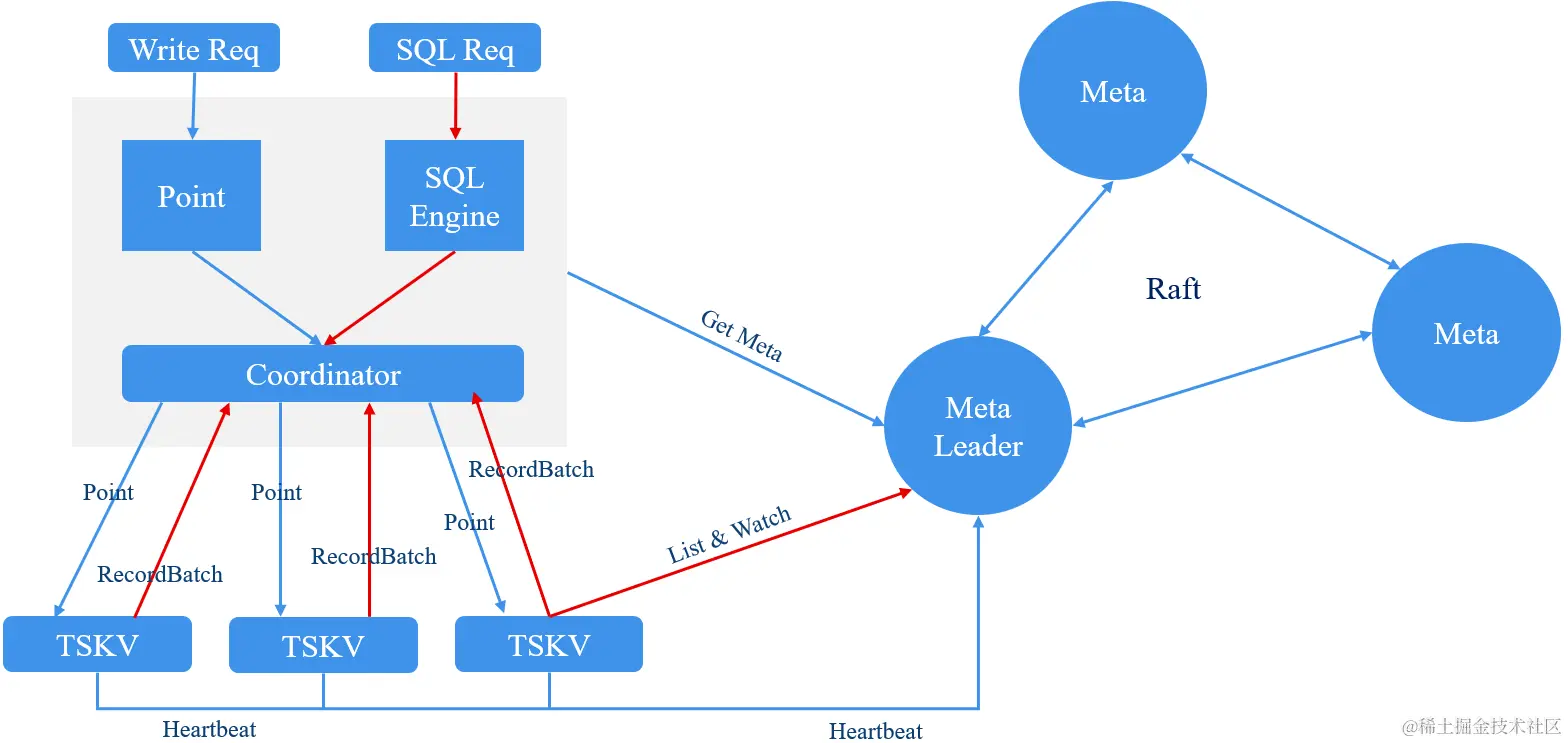 我们还想讲一讲CnosDB的分布式功能。CnosDB分布式由两类节点组成:Meta节点与Data节点。Meta节点用于存储集群相关的元信息,像数据位置分布、Data节点信息、用户权限、DB、Table等相关信息;Meta是基于Raft实现的一套CP存储系统,保证元信息存储高可用强一致性。Data节点用于数据的存储与查询,当前存储与查询相关功能都在Data节点实现;后期可能会做计算、存储分离,存储功能单独一个进程,无状态的计算节点单独进程。