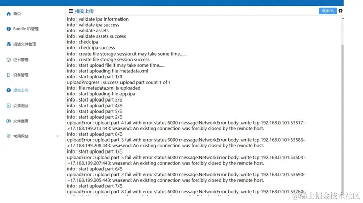 在选择 IPA 文件和设置密码后,我们可以开始进行上传操作。点击上传按钮,等待上传完成。