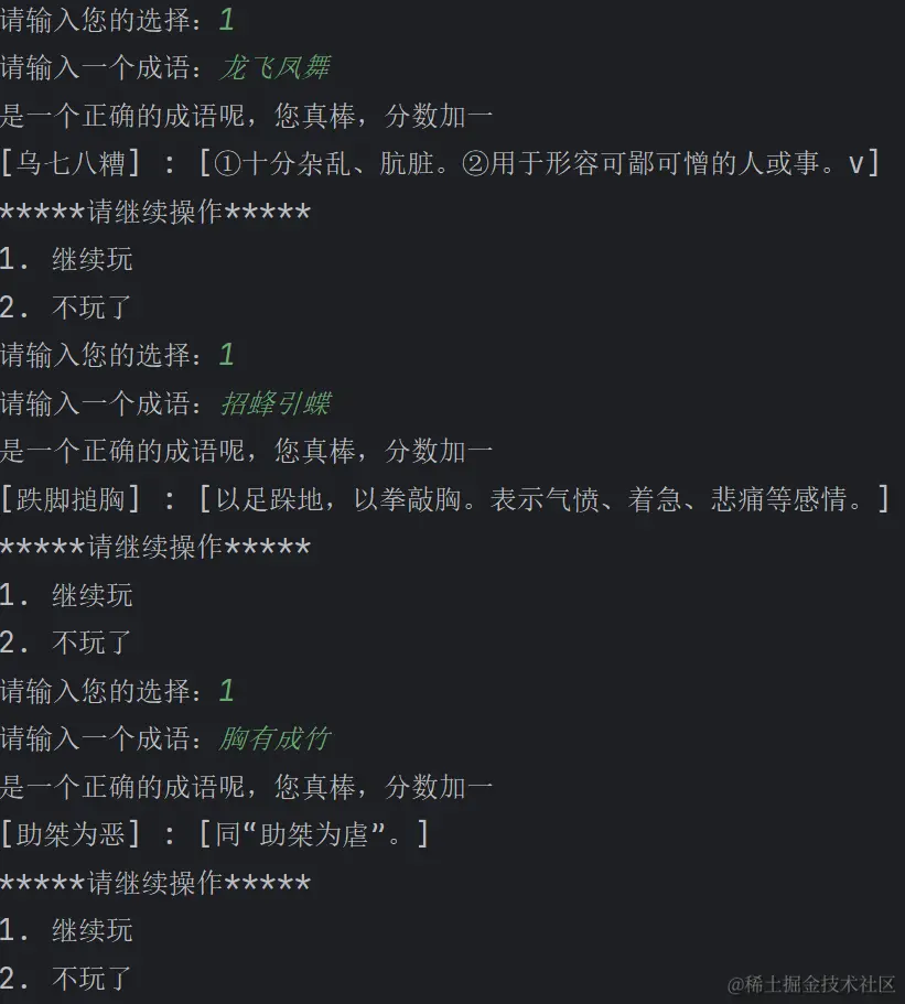 首先由get_all_starts_with函数根据一个汉字的拼音,从数据中找出所有以该拼音开头的成语,并返回一个列表作为所有匹配的成语,当列表不为空的时候,在列表中随机选择一个成语返回即可,当列表为空时,就返回"没有找到以你输入成语开头的成语,请换一个成语试试",也就是输了的意思,但是为了保证提升您使用成语能力,到目前为止,游戏并不会结束,当你换了一个成语输入时,就会进行下一轮判断。