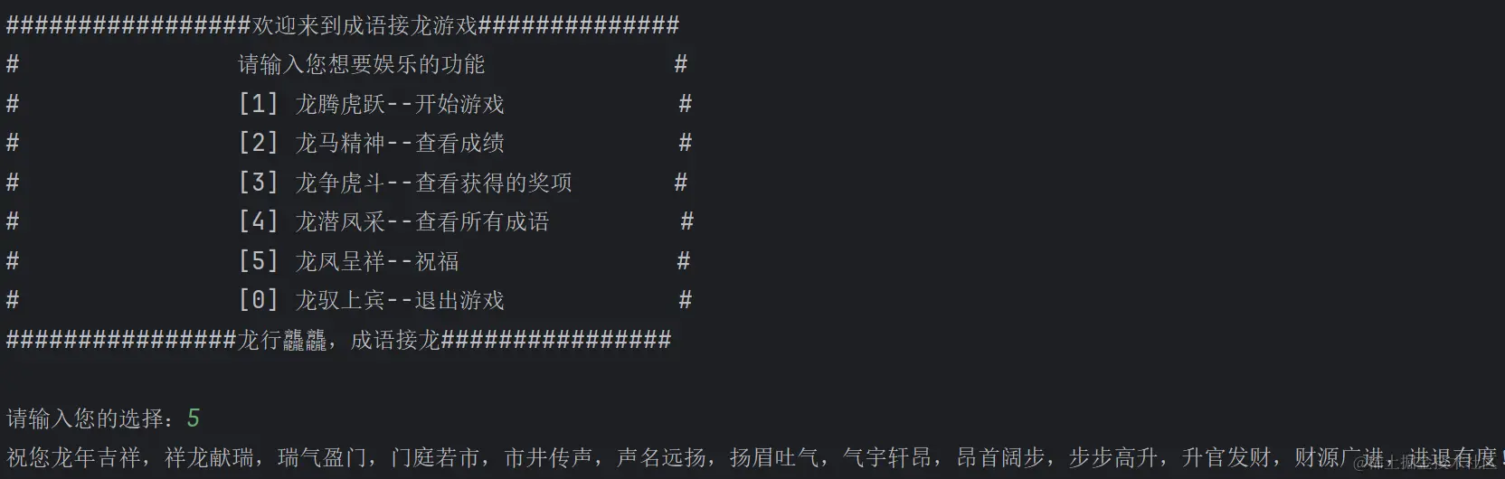 print("欢迎下次再来玩成语接龙")